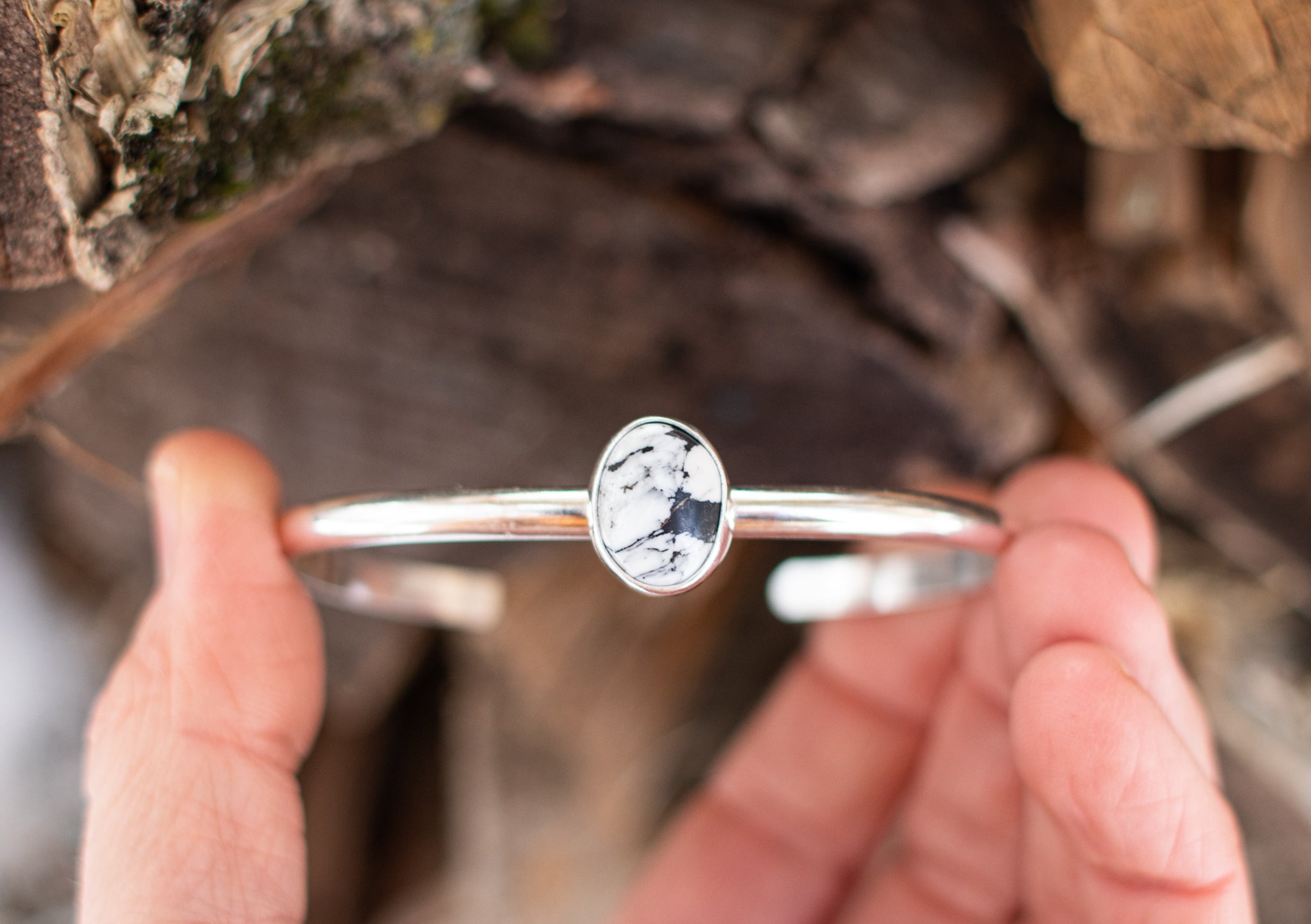 White buffalo stone cuff, 0.43" by 0.53". on a size 6" sterling silver cuff.