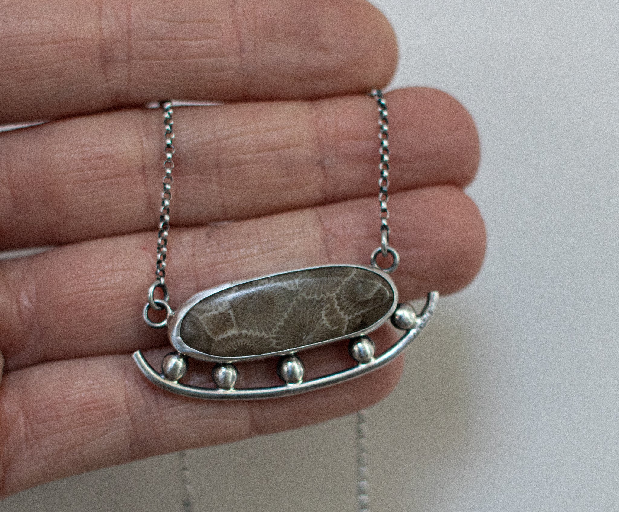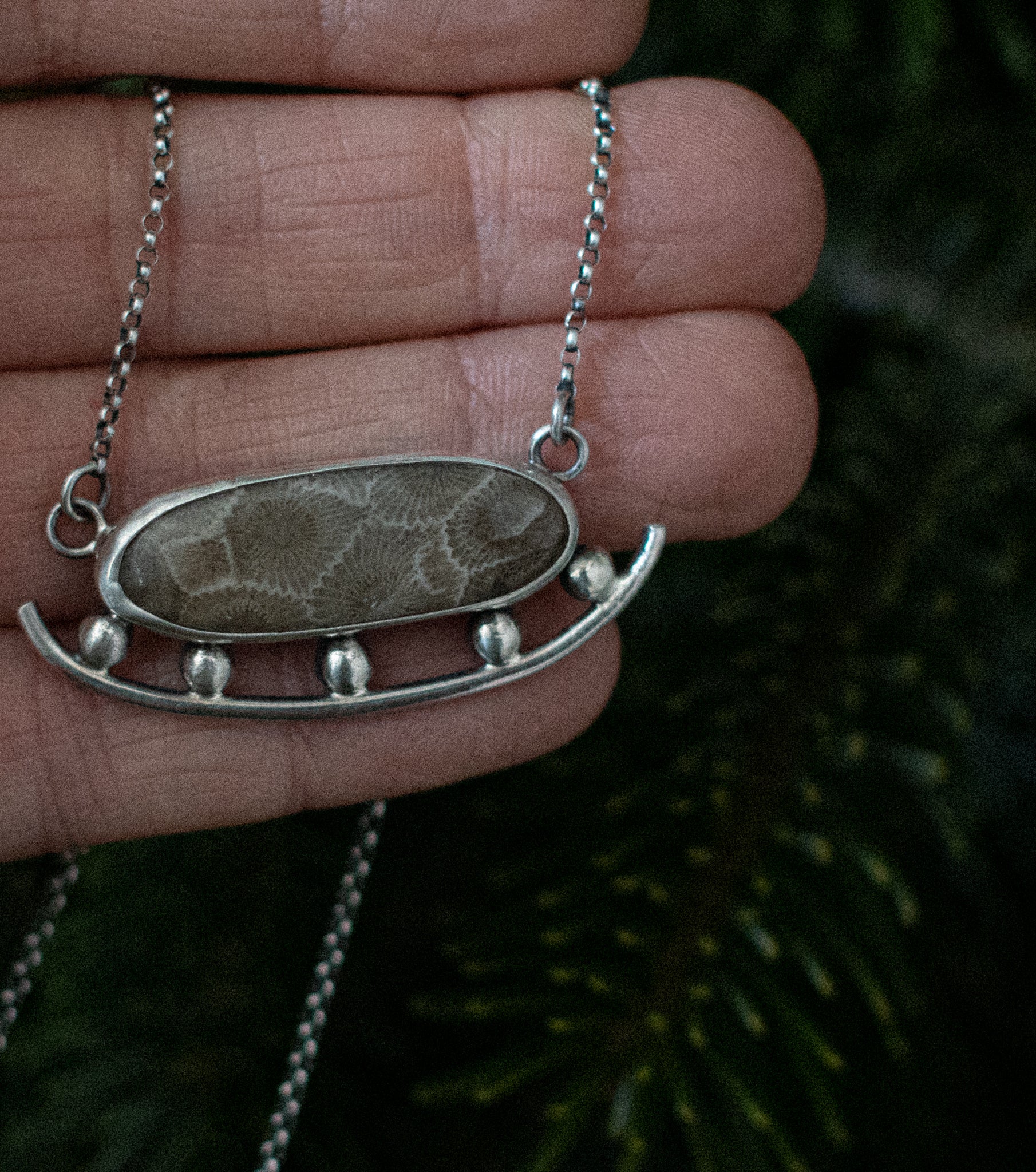 Swooop petoskey necklace! 1.2" long and 0.65" wide, this baby is a statement. Hung from a heavilly oxidized rolo chain, measuring 18".