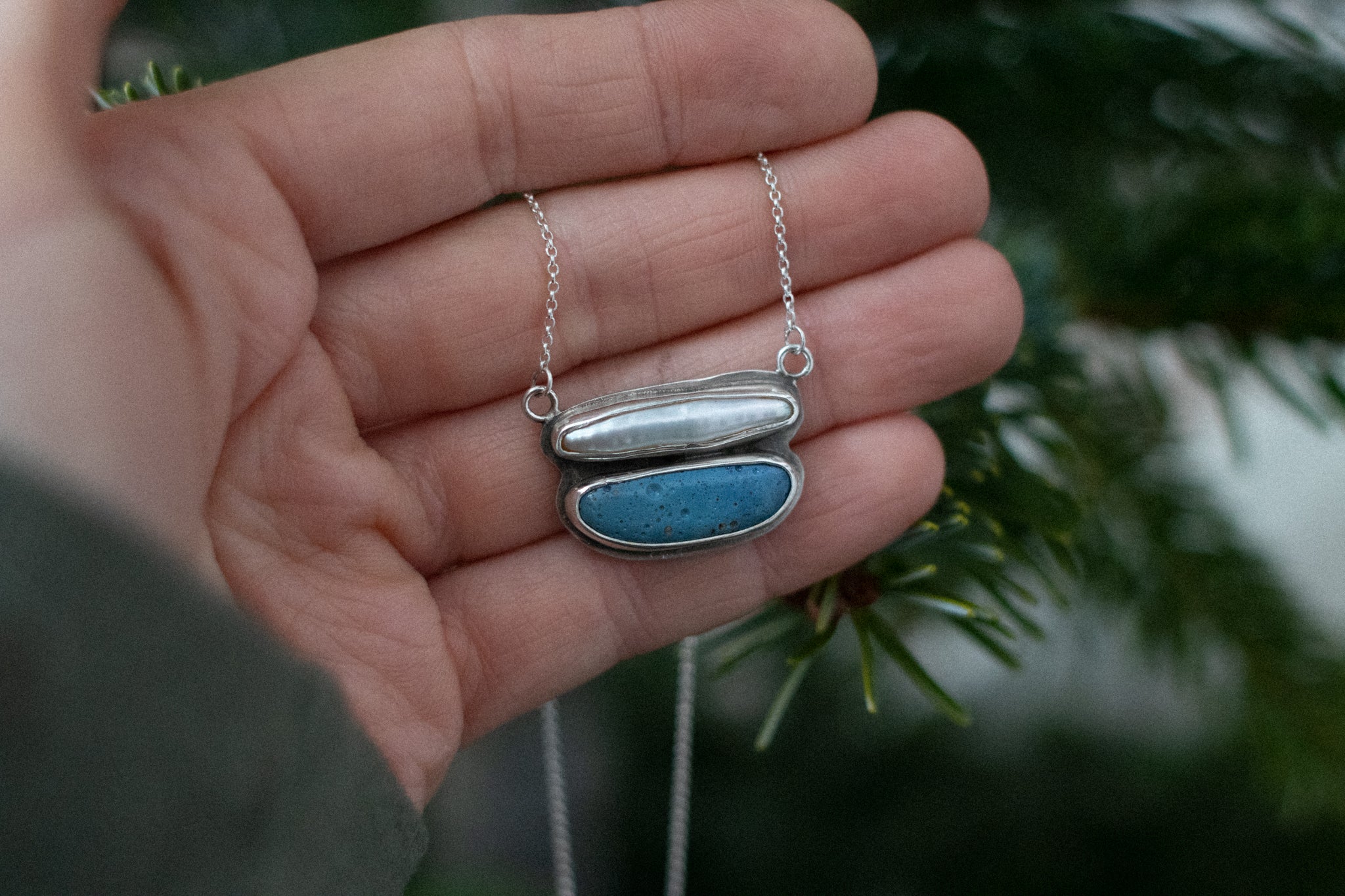 Leland and fresh water pearl necklace, hanging from a 19" chain. The setting measures 1" by 0.68". If you want the chain to be a different length, let me know and I can change it up for you!