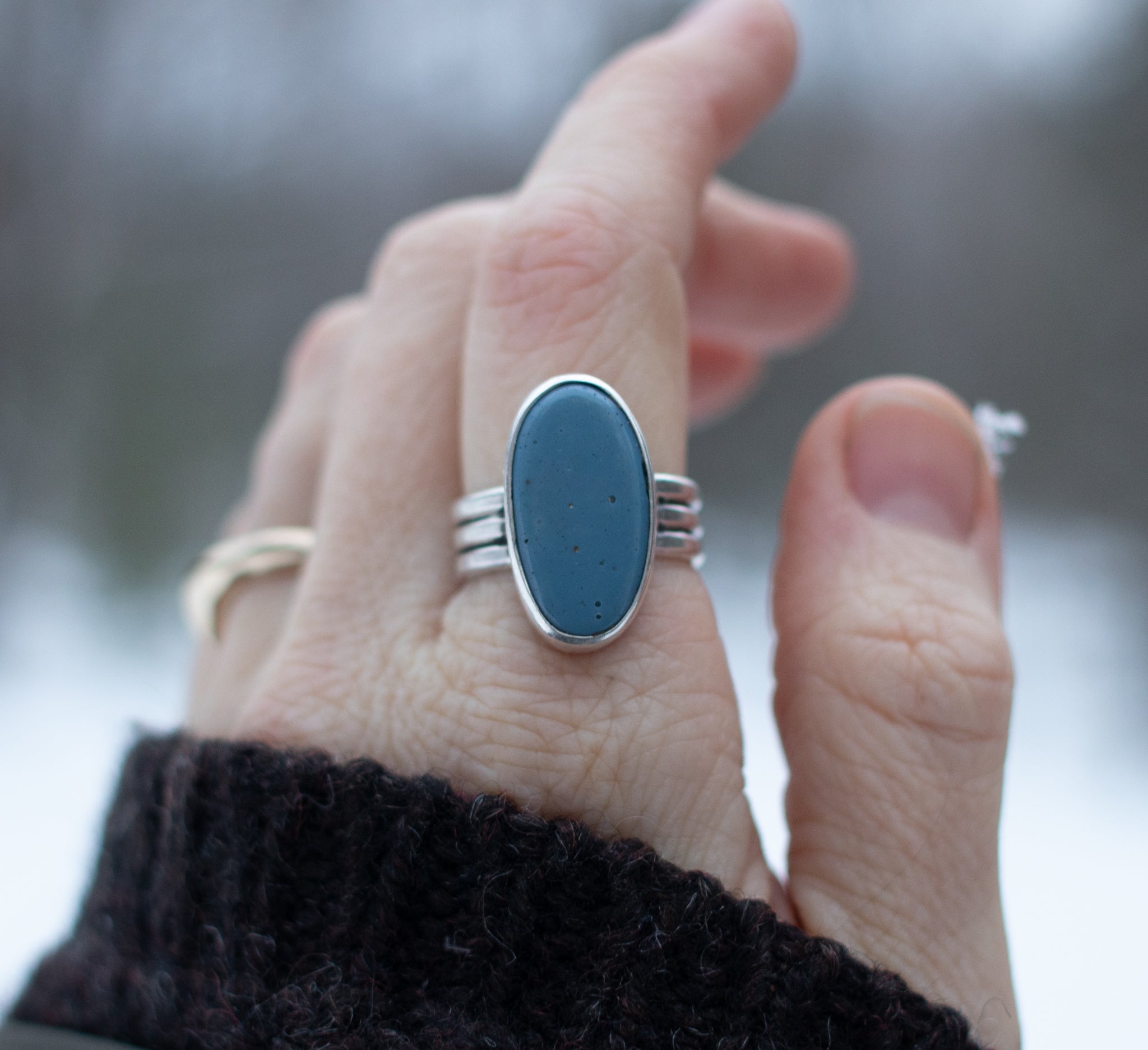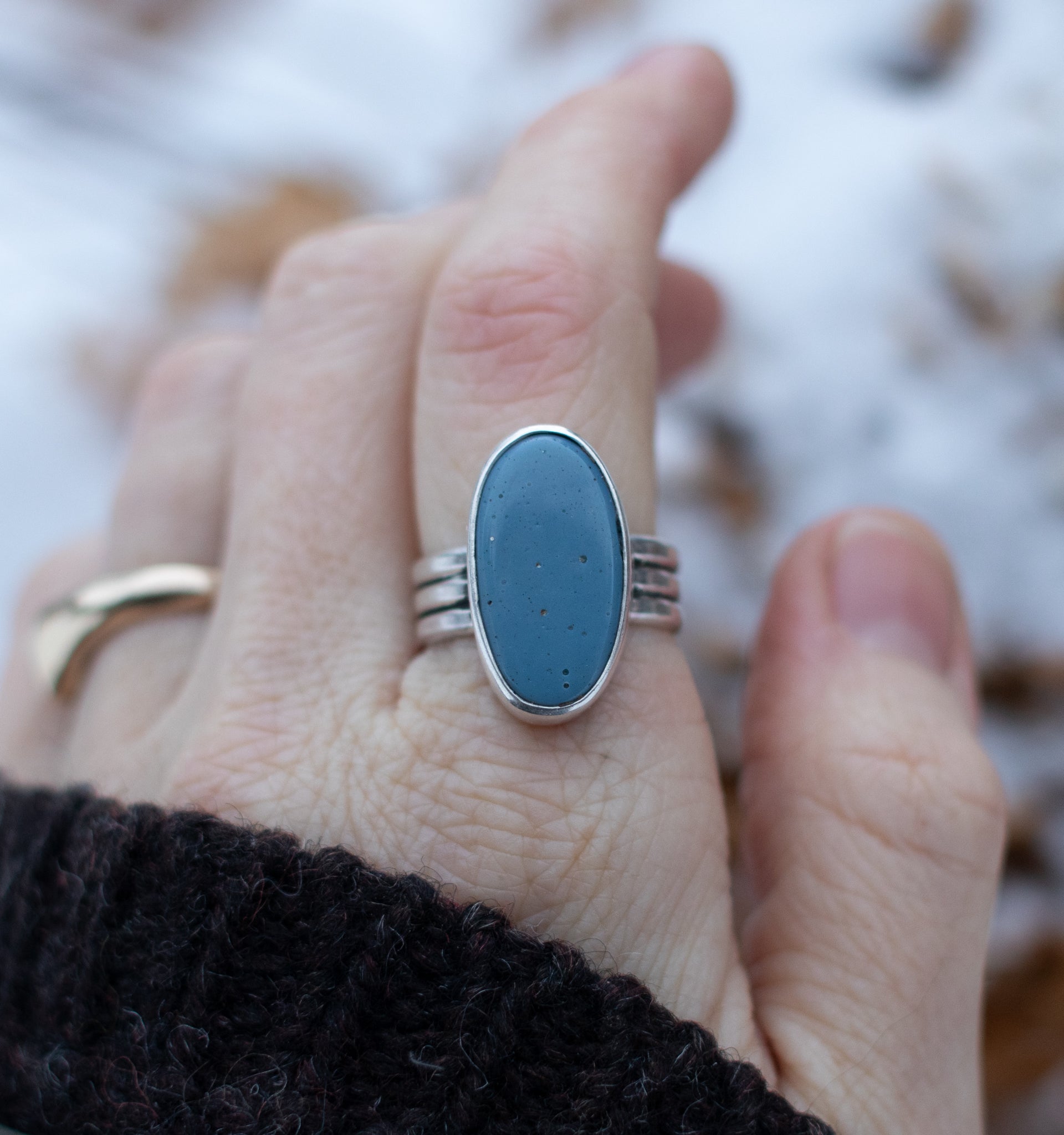 Big ole hunk of blue, measuring 0.84" by 0.46". Wrapped in a simple sterling silver bezel, and sitting on a wide band 1/4".