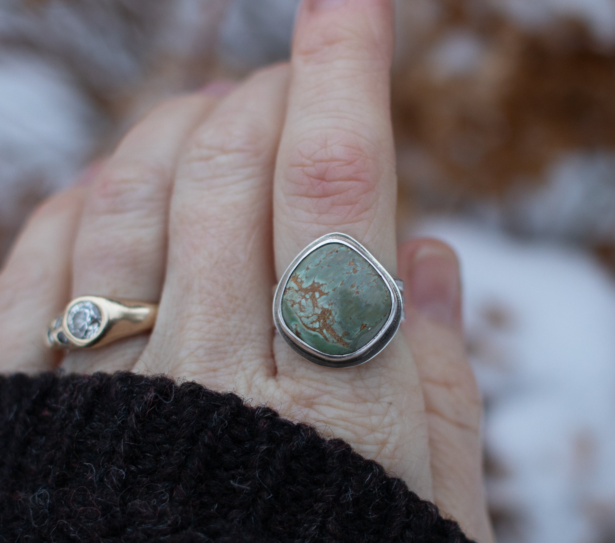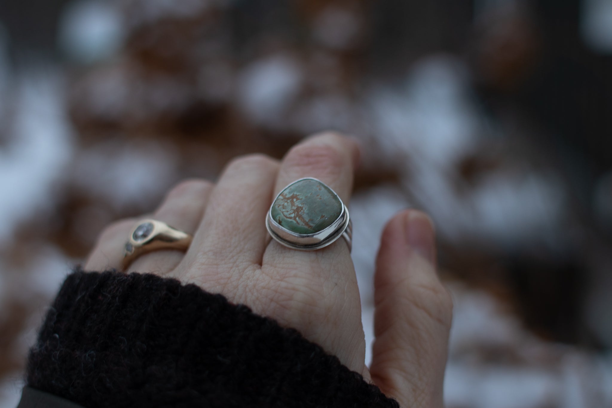 I neeed to start keeping better track of what variety of turquoise I get. I have nooOoO idea what this is (maybe royston? maybeee not?!) but I know its amazing. Green turquoise, little silver lip surround, sitting on an extremely comfortable size 7 ring band.