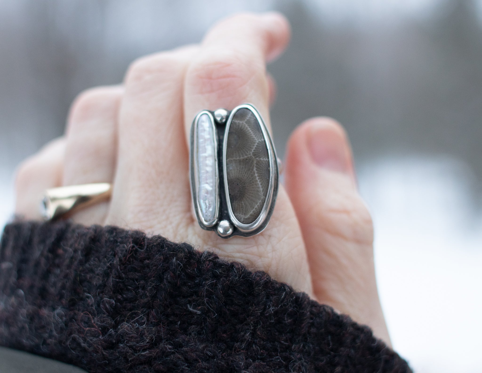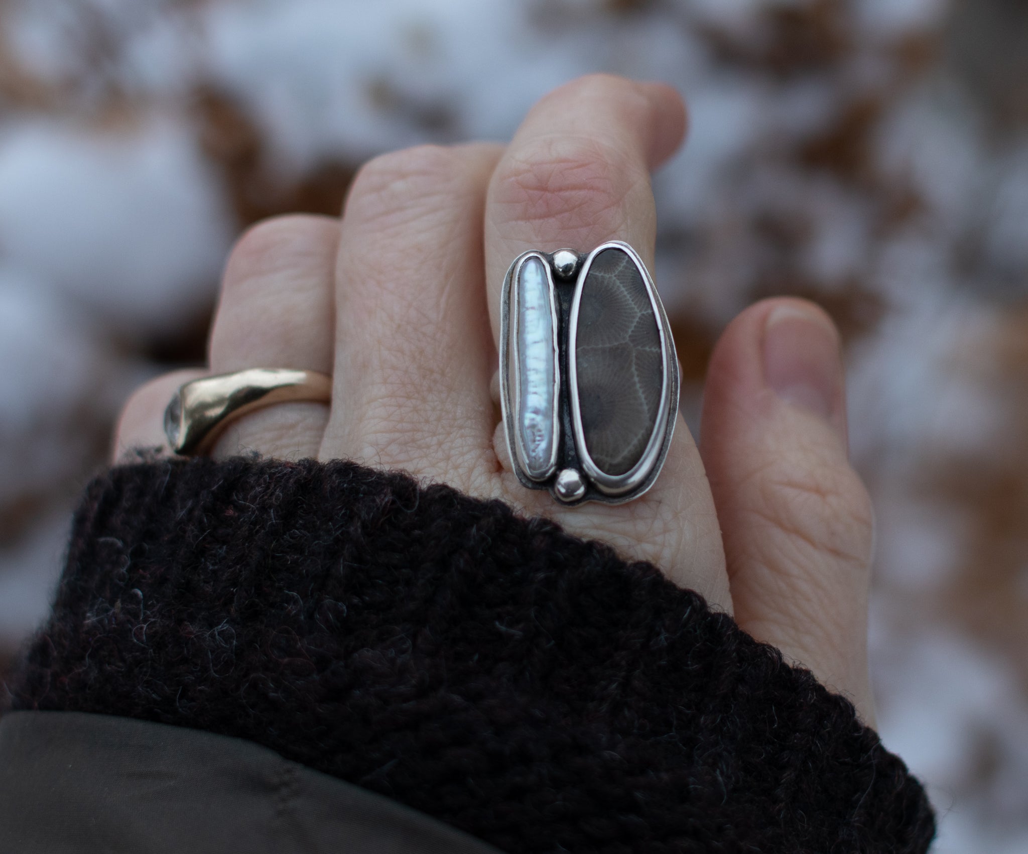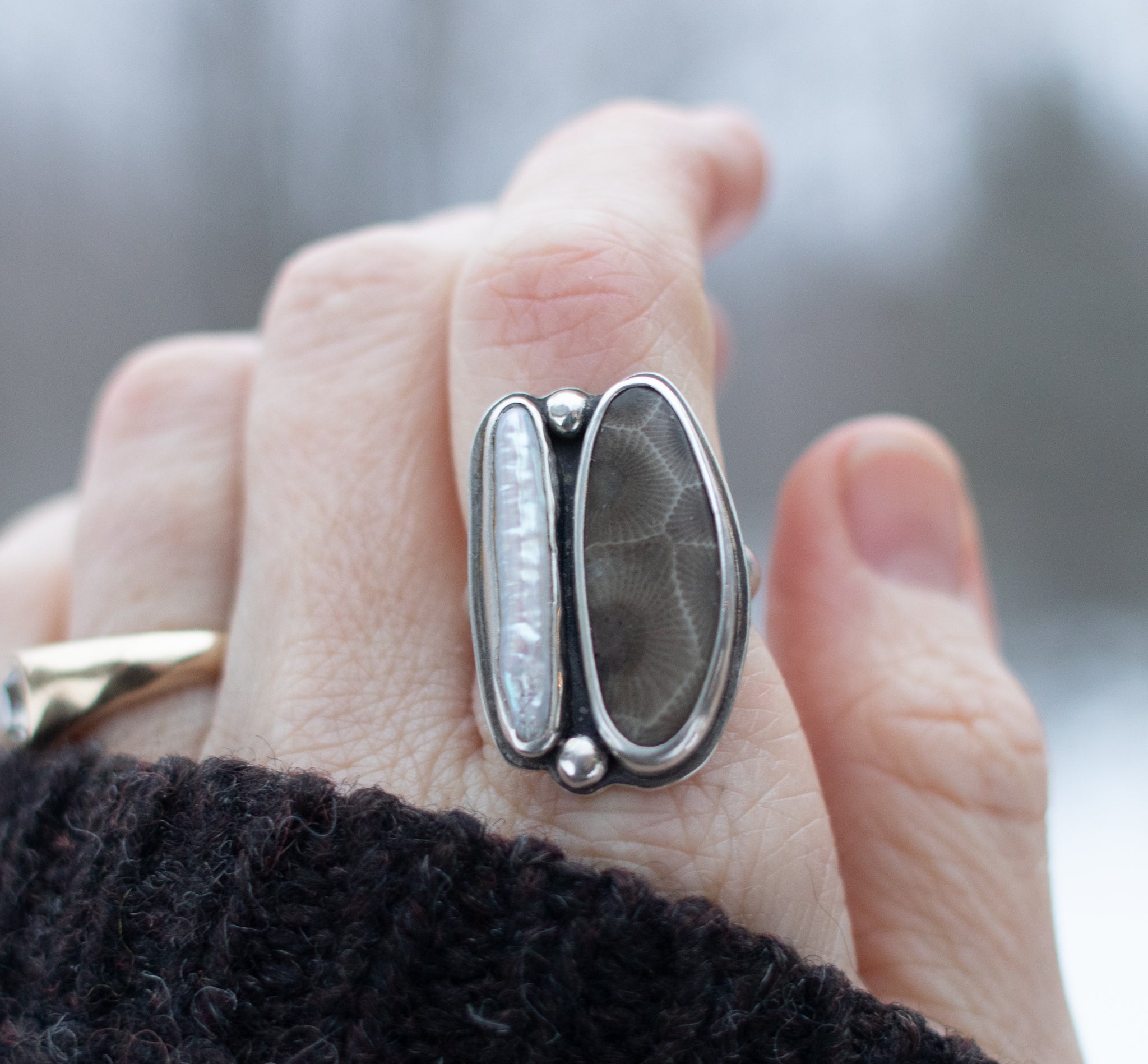 Petoskey stone, fresh water pearl. dot accents. Size 6 simple band. The setting measures 1" by 0.7".