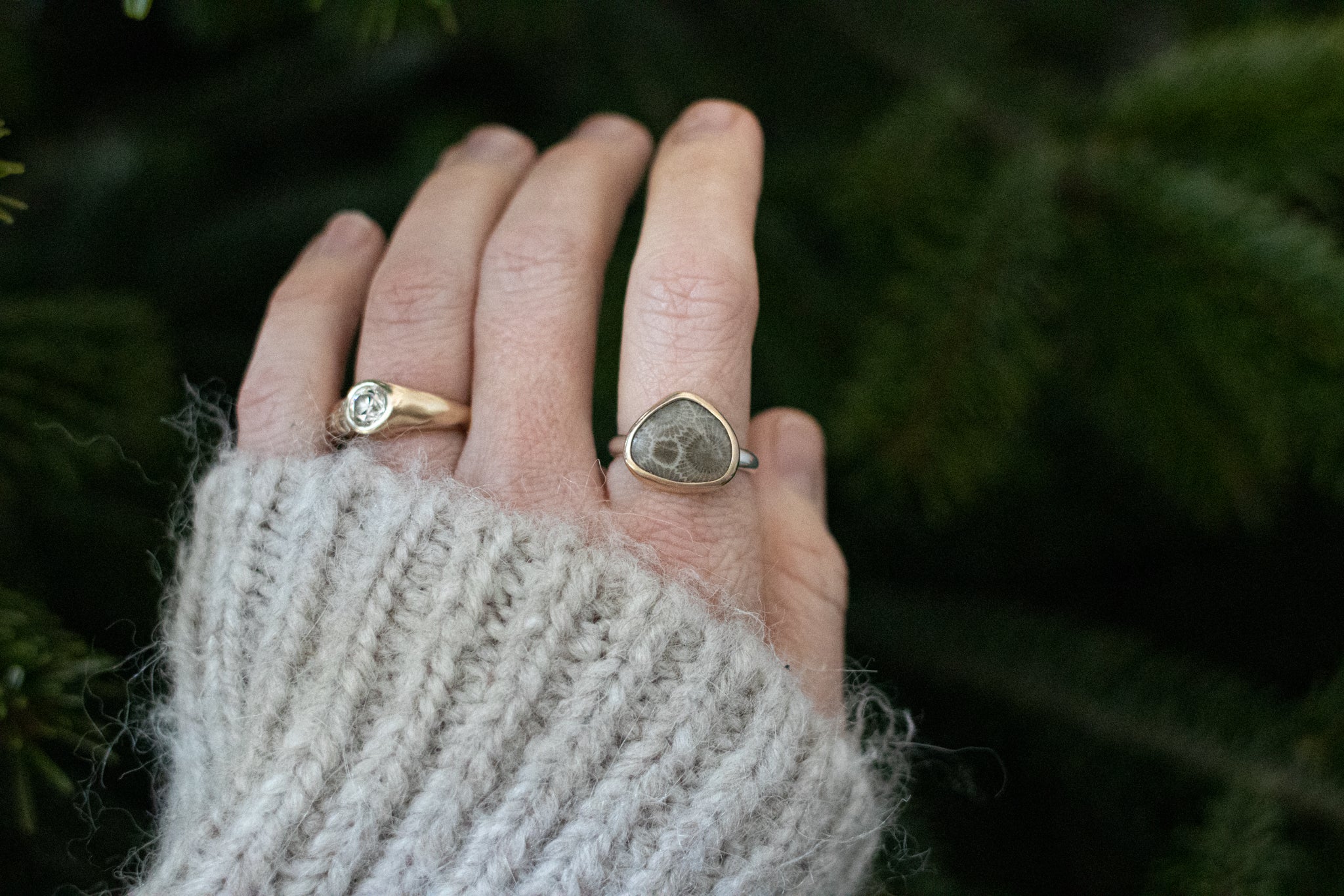 Pretty little petoskey, set in a simple 14k bezel, measuring 0.5" by 0.6", on a sterling silver ring band, in a size 8.
