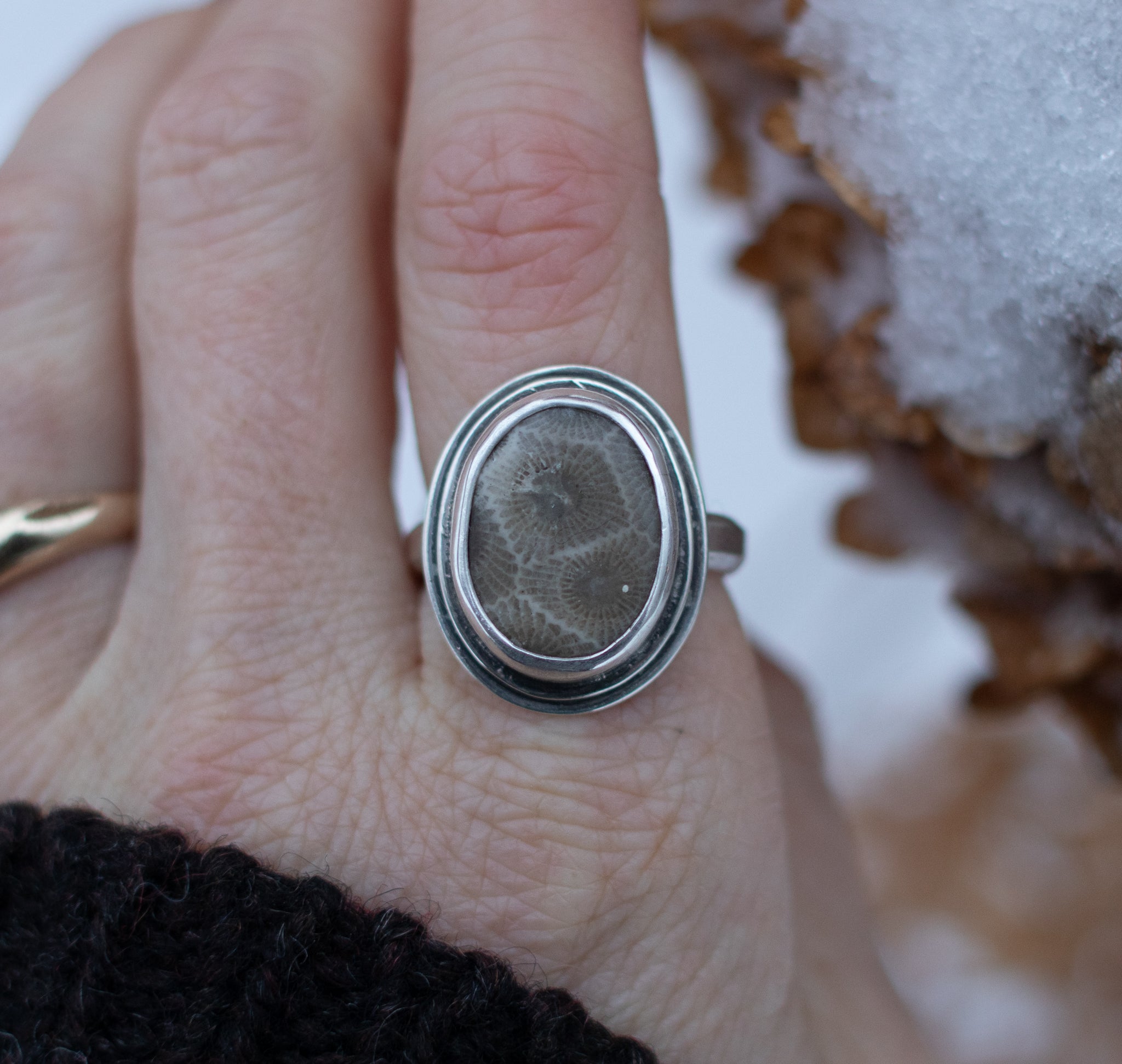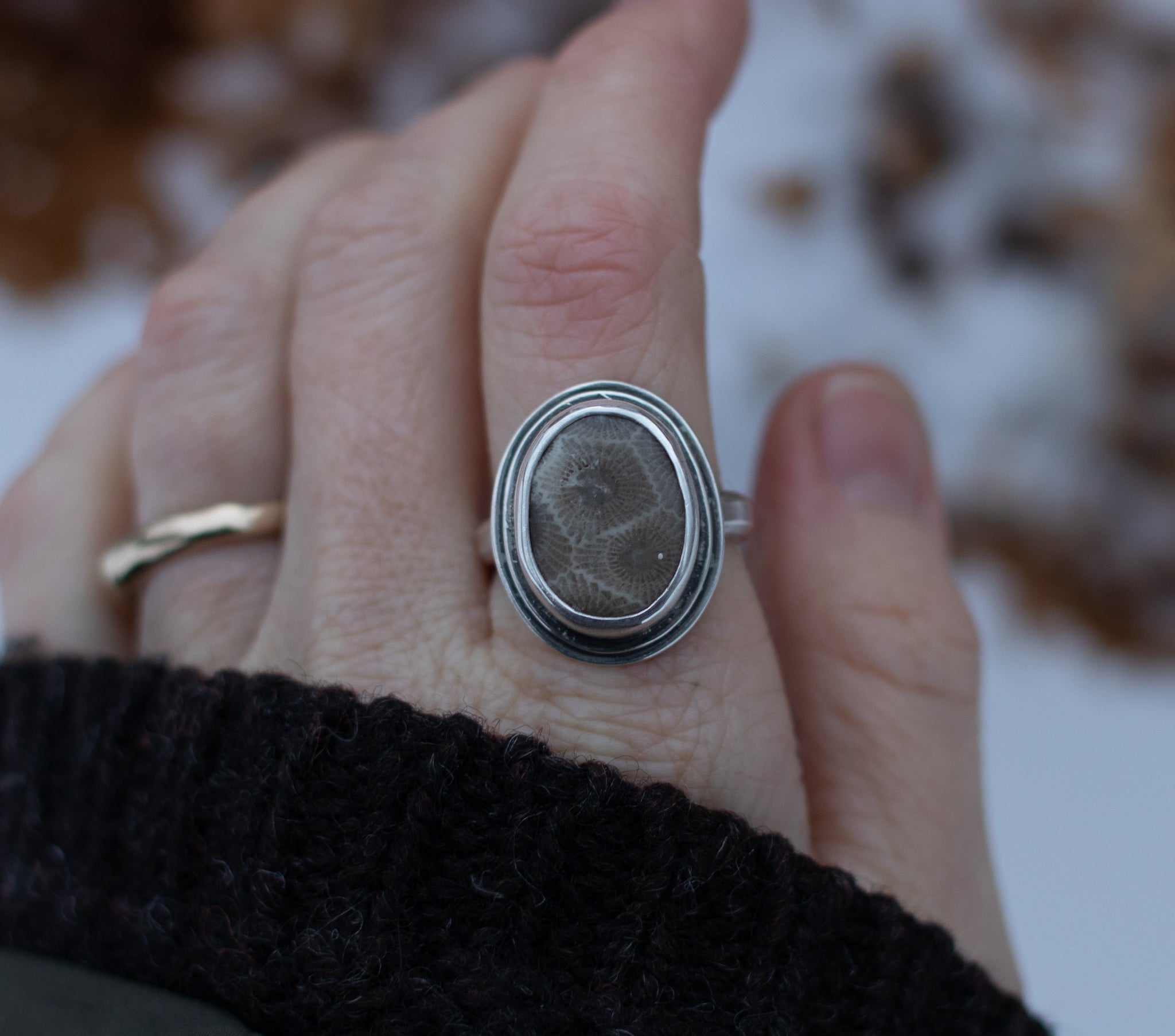 Petoskey wrapped in a sterling silver bezel, sitting on 2 layers of oxidized sterling silver. The ring band is a little angular, in a size 9.