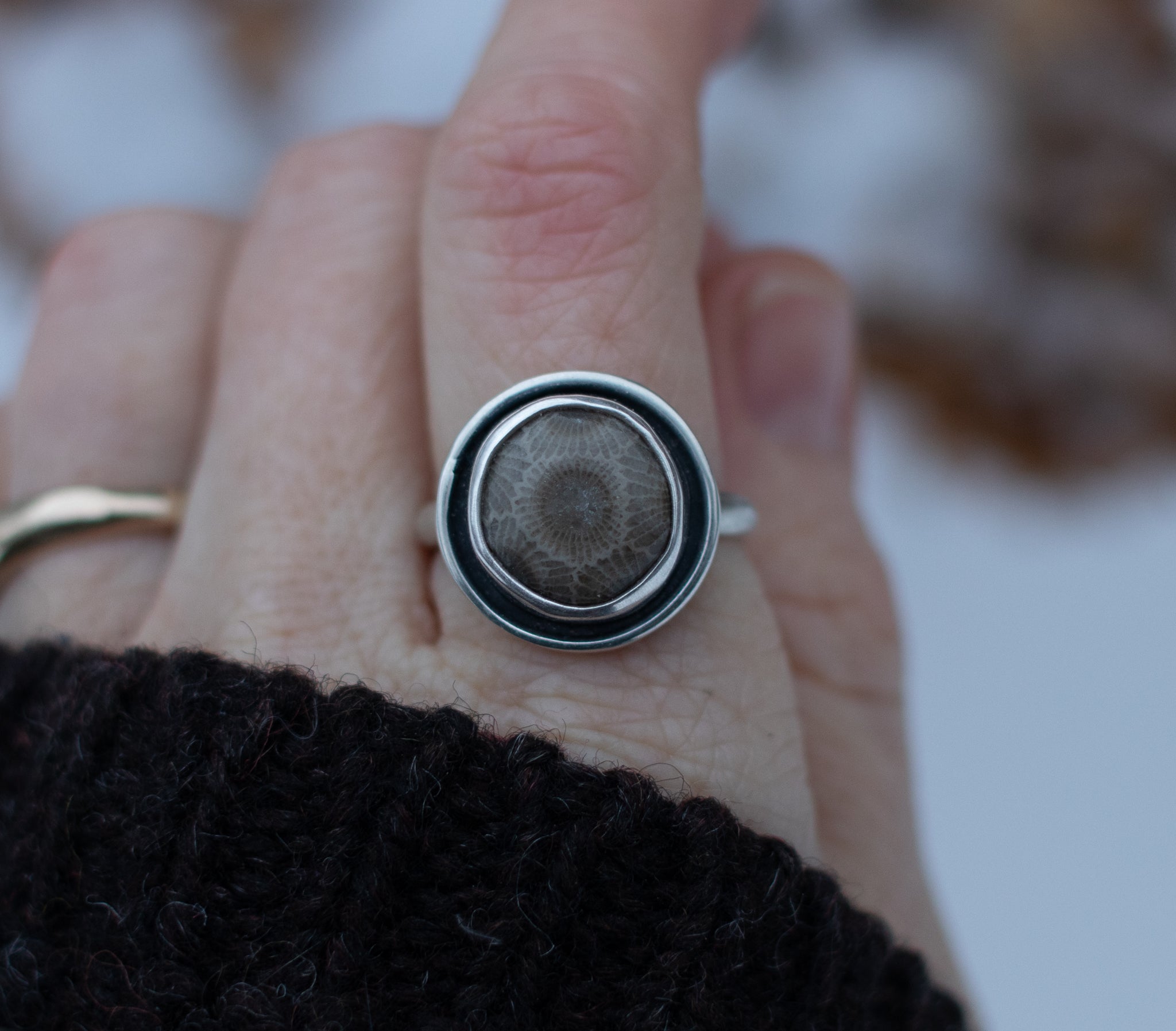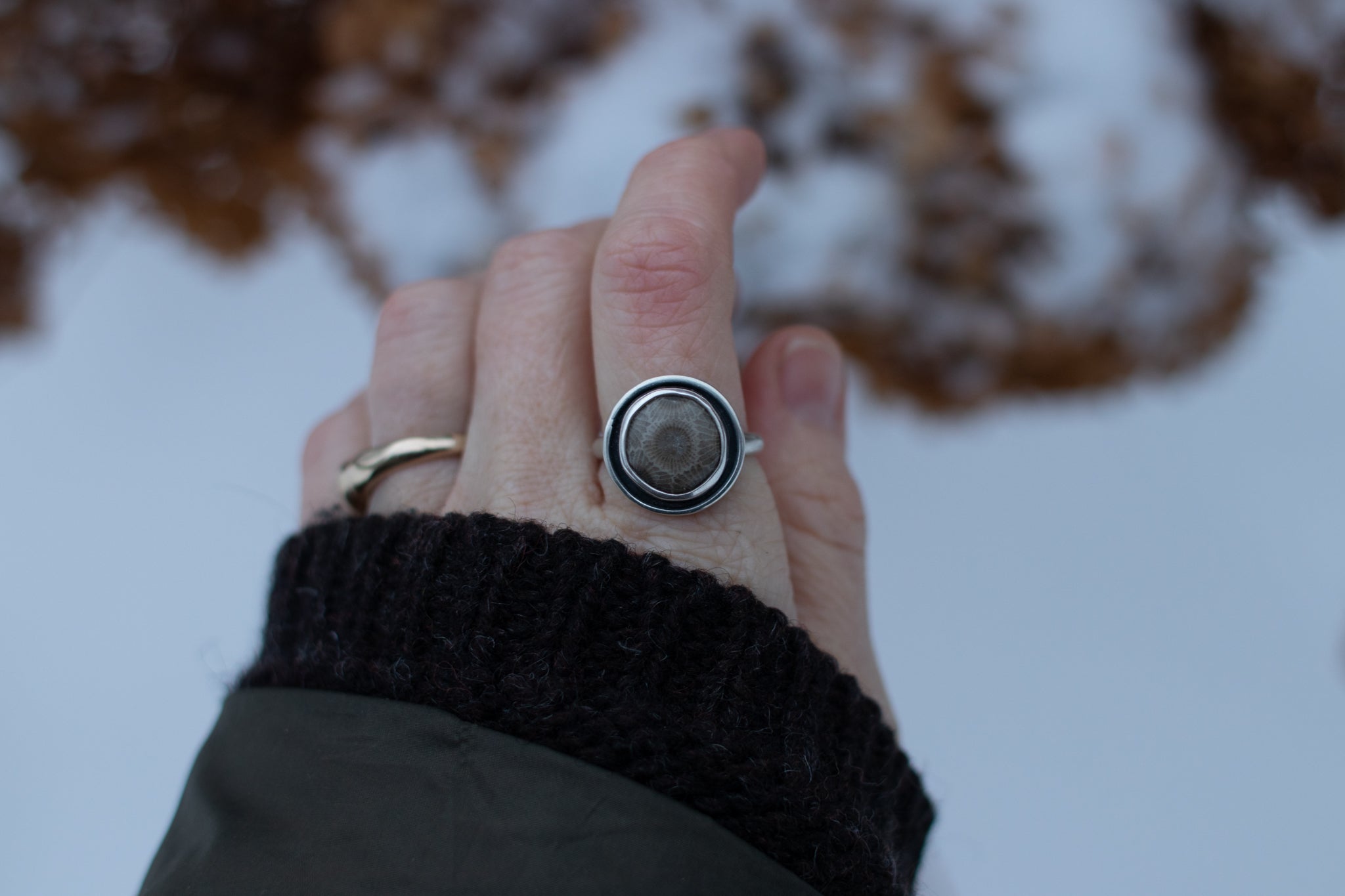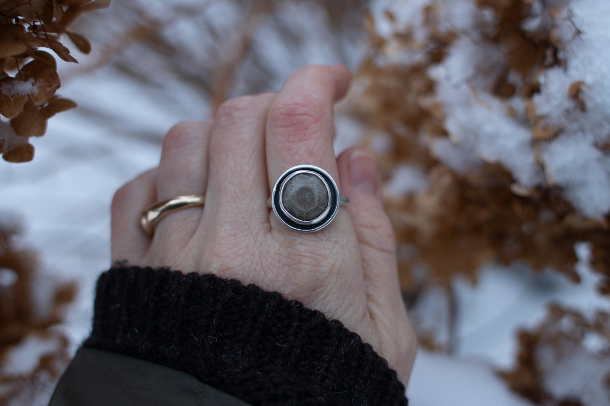 Check out this soccer ball! Petoskey styyyyle! Wrapped in sterling silver, with a shadowbox design. Sitting on a size 9 ring band. 0.68" around. Oxidized.