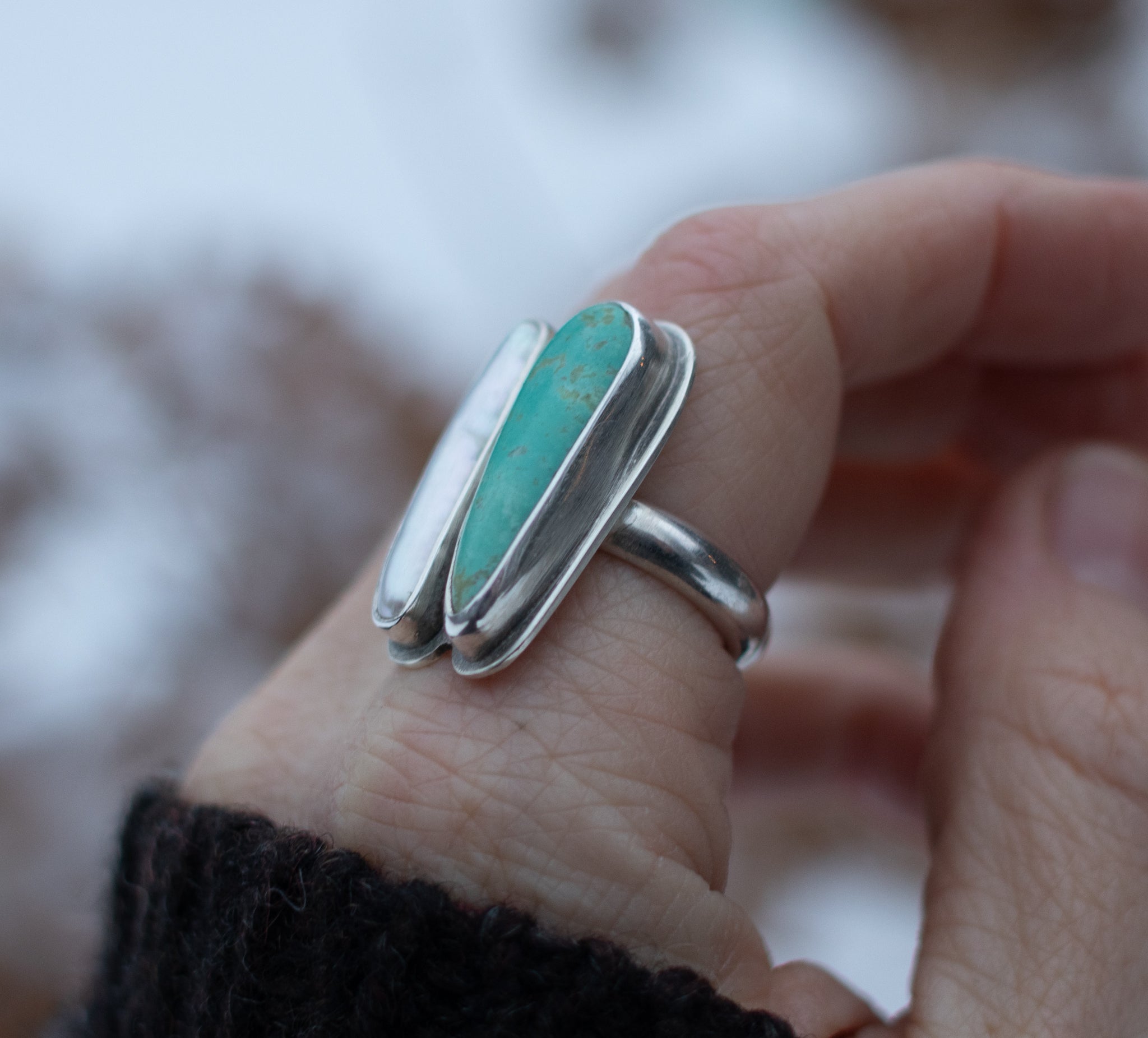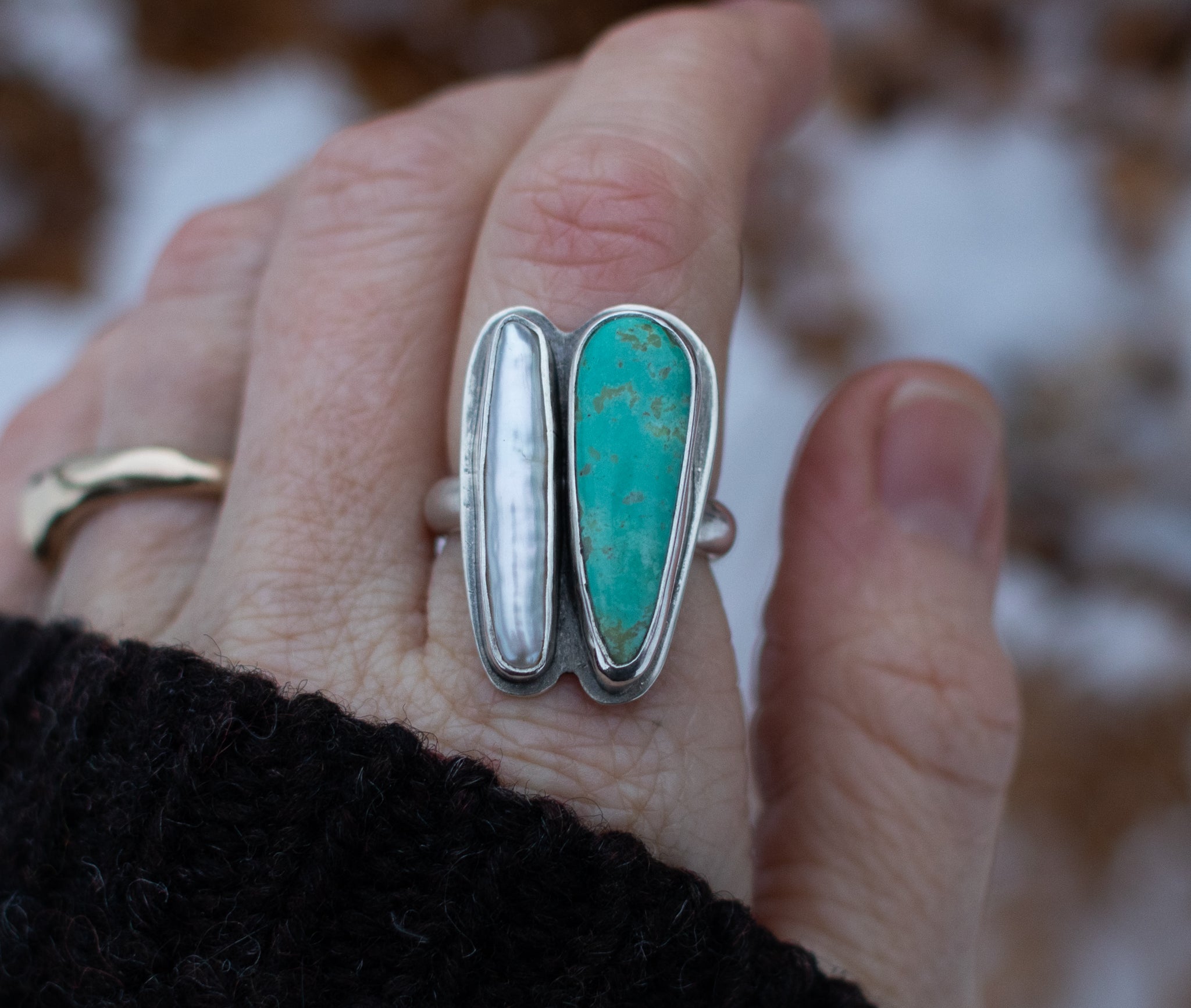 Another turquoise that I don't know the name of. (sorry!0 and freshwater pearl. 0.68" by 1" long. Sitting on a simple size 8 ring band.