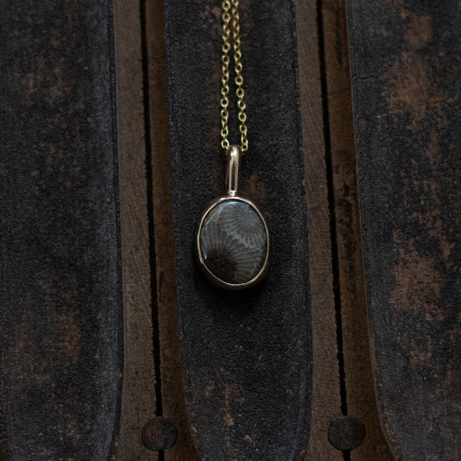 Another amazing petoskey, wrapped in 14K gold, with a 14k gold bail. Sitting on sterling silver backplate, and hung on a 14k GF chain, 18".